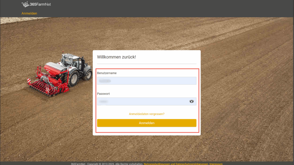 Öffnen Sie die Webseite www.app.365farmnet.com in Ihrem Browser. Melden Sie sich mit Ihrem Benutzernamen und Passwort an, um Ihr Konto zu öffnen.