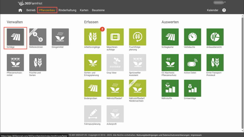Screenshot: Tab „Pflanzenbau“ mit Kachel „Schläge“