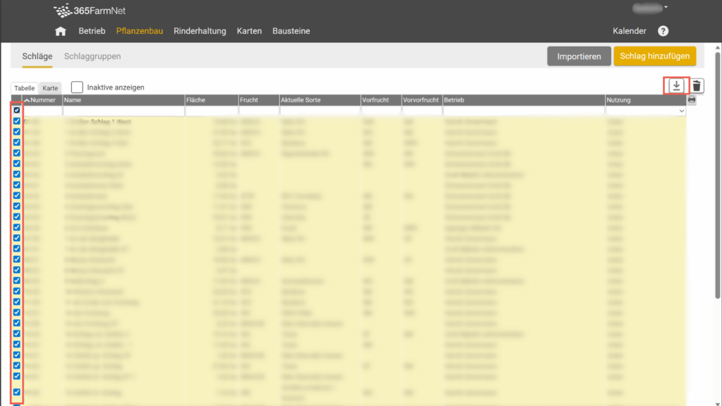 Sie sehen nun eine Liste aller Schläge, die in Ihrem Betrieb verfügbar sind. Sie können einzelne Schläge über die Kästchen links neben den Schlagnamen auswählen. Wenn Sie alle Schläge exportieren möchten, aktivieren Sie einfach das oberste Kontrollkästchen, um alle Einträge zu markieren.