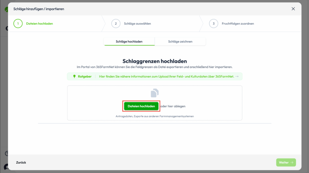 Mit 365FarmNet können Sie Ihre Schlaggrenzen einfach exportieren und in Agmeo importieren. Diese Anleitung zeigt Ihnen Schritt für Schritt, wie Sie die Shape-Datei aus 365FarmNet herunterladen und anschließend in Agmeo hochladen und prüfen.