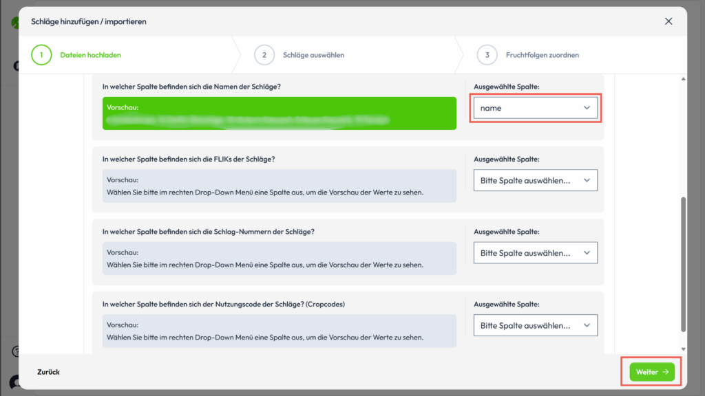 Nach dem Hochladen erkennt Agmeo automatisch die in der Shape-Datei enthaltenen Schläge. Im Importdialog können Sie folgende Zuordnungen treffen: