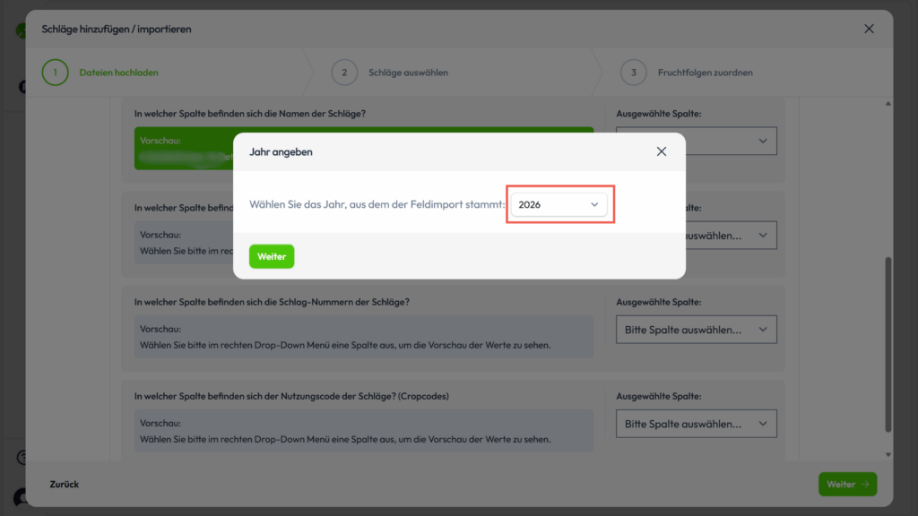 Klicken Sie anschließend auf Weiter. Im nächsten Fenster wählen Sie das Jahr des Feldimports aus, aus dem die Daten stammen.