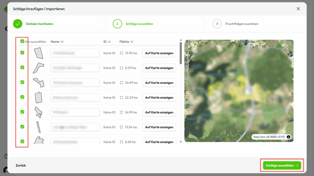 Nun sehen Sie eine Übersicht aller importierten Schläge. Hier können Sie einzelne Schläge umbenennen, löschen oder prüfen. Wenn alle Angaben korrekt sind, klicken Sie auf Schläge auswählen, um fortzufahren.