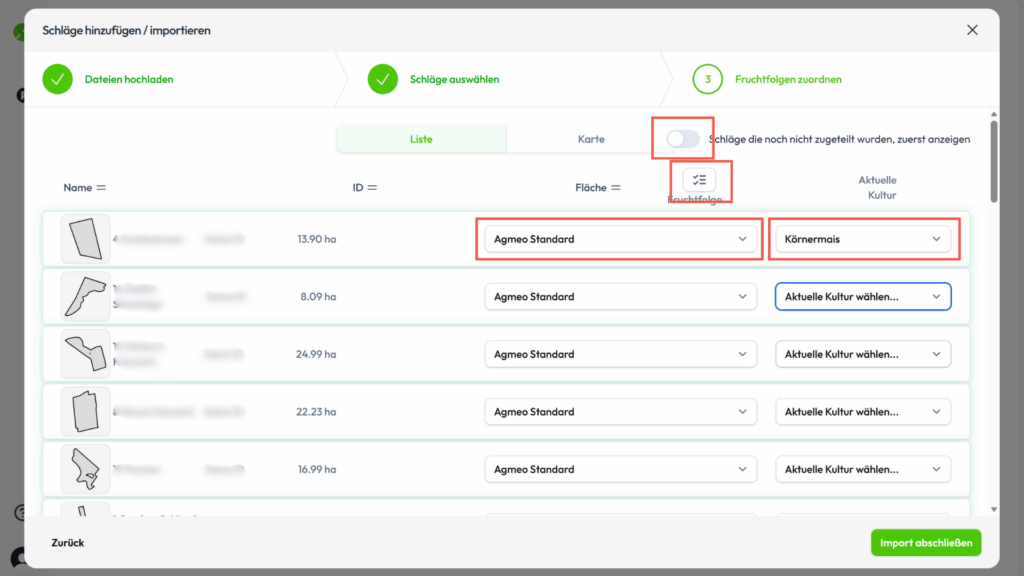Auf der nächsten Seite ordnen Sie den Schlägen die passenden Kulturen und Fruchtfolgen zu. Wenn alle Zuordnungen abgeschlossen sind, klicken Sie auf Import abschließen, um den Vorgang zu beenden.