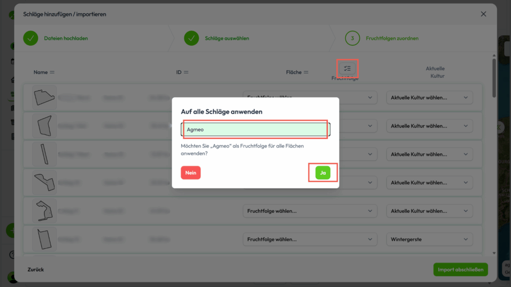 Im nächsten Schritt ordnen Sie den importierten Schlägen Fruchtfolgen und Kulturen zu. Sie können diese Zuordnung manuell für jeden Schlag vornehmen oder über die Option Allen Feldern dieselbe Fruchtfolge zuordnen eine gemeinsame Auswahl treffen. Nicht zugeteilte Schläge lassen sich anschließend gezielt nachbearbeiten.