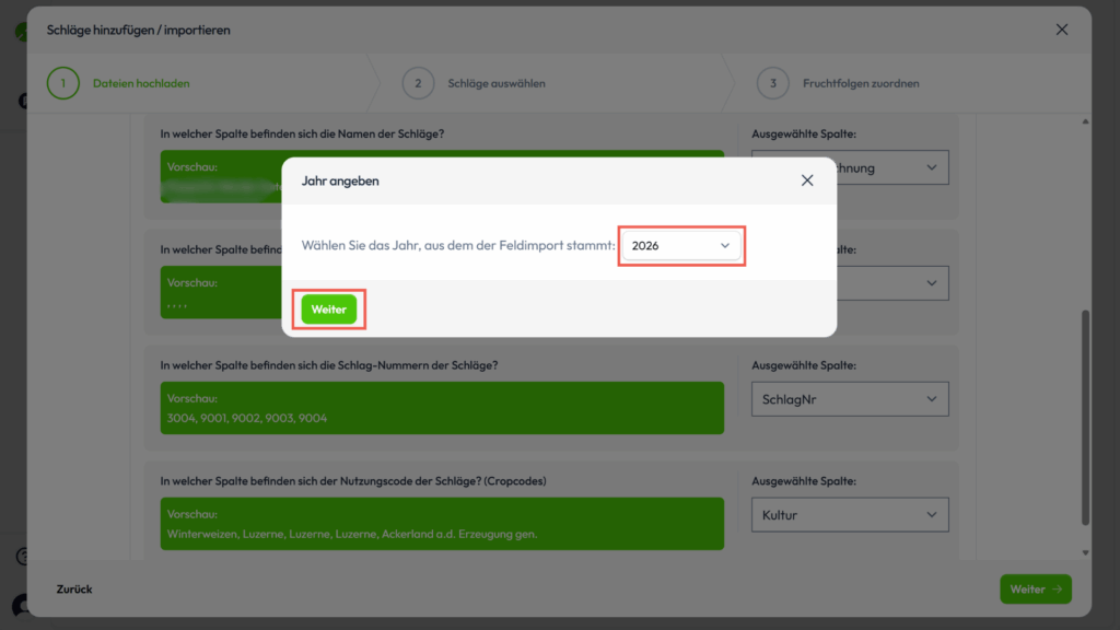 Nach der Zuordnung werden Sie aufgefordert, das Importjahr zu wählen. Dies legt fest, für welche Saison die Schläge gelten und erleichtert später die Zuordnung der Kulturen. Wählen Sie das entsprechende Jahr und klicken Sie auf Weiter.